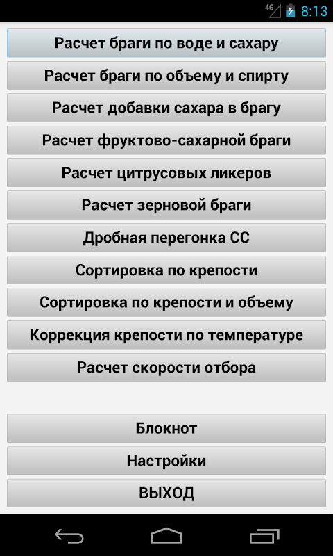 Исходя из желаемых параметров (объем браги, крепость) рассчитывает необходимое количество воды, сахара и дрожжей для затора.