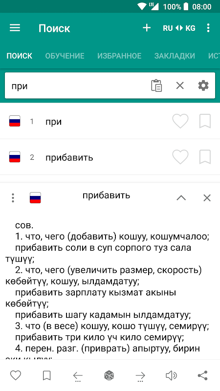 Kamus Rusia-Kyrgyz dan Kyrgyz-Rusiaoffline dengan antarmuka yang mudah dan fungsional mencakup lebih dari 70.000 kata. (Kyrgyzcha-oruscha jana Oruscha-kyrgyzcha sozduk)