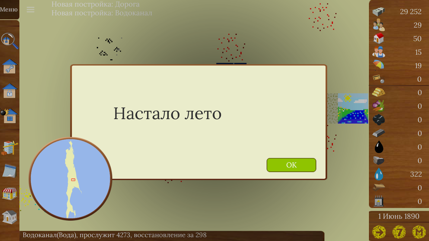 Вы можете создавать 33 вида строений.В некоторых клетках земли находятся определенные ресурсы (лес, вода, уголь и т.д.). Каждый день строения расходуют ресурсы и приносят прибыль. Некоторые строения могут работать только в определенные времена года.