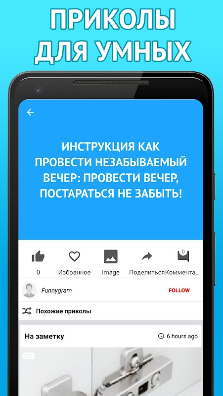 Делитесь наиболее понравившимися приколами вместе с друзьями через соцсети или мессенджеры. Если какой-либо пост понравился – ставьте лайки и оставляйте комментарии. Просто нажав на соответственную кнопку телефона, любая фотография, пост или анимация мгновенно скачается.