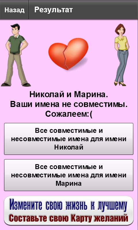 Узнайте подходят ли ваши имена друг другу. Выберите свое имя и имя партнера. Приложение даст ответ - что ждет вас и вашего партнера. Любовь (брак), расставание или неопределенное будущее. Также есть информация по каждому имени: происхождение, значение имени, именины.
