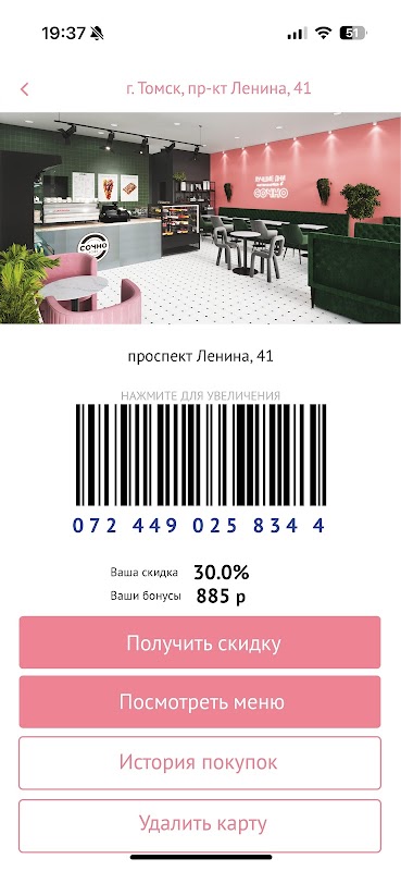 Daftar di aplikasi dan dapatkan kartu virtual dengan diskon 5% di semua kedai kopi SochnoKofe. Dengan membaca Kode QR di tempat kami, Anda dapat terhubung ke program diskon dan bonus di kedai kopi tertentu.