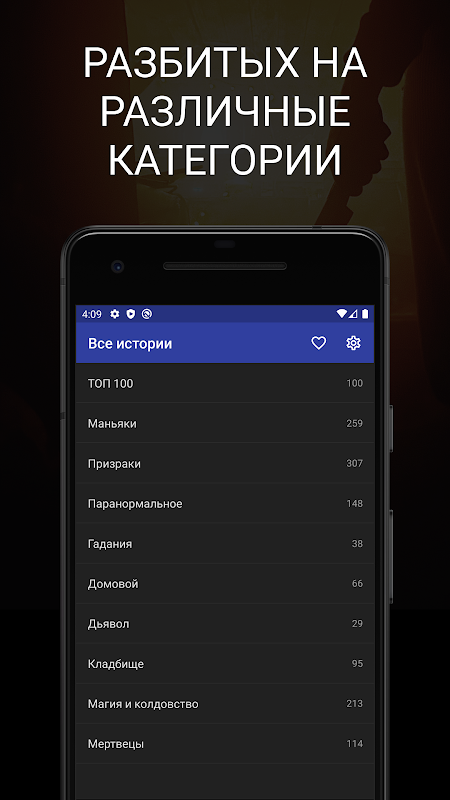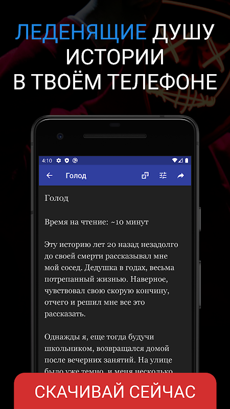 - С нашим приложением у вас есть возможность читать страшилки без интернета каждый день