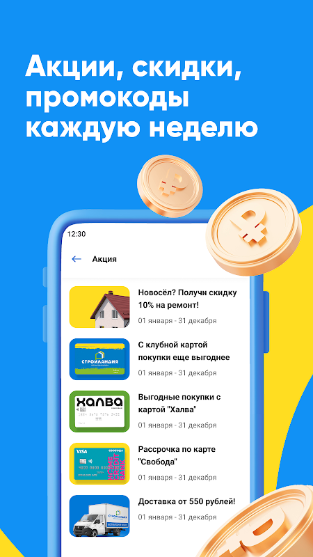 Stroylandia bukan hanya material konstruksi, tetapi pasar konstruksi lengkap dengan promosi, bonus, dan dukungan. Aplikasi ini telah mengumpulkan barang-barang terbaik untuk rumah dan renovasi Anda — semuanya di satu tempat. Renovasi dan konstruksi tidak hanya membutuhkan material yang andal, tetapi juga banyak waktu — itulah sebabnya kami menyediakan pengiriman material konstruksi yang cepat.