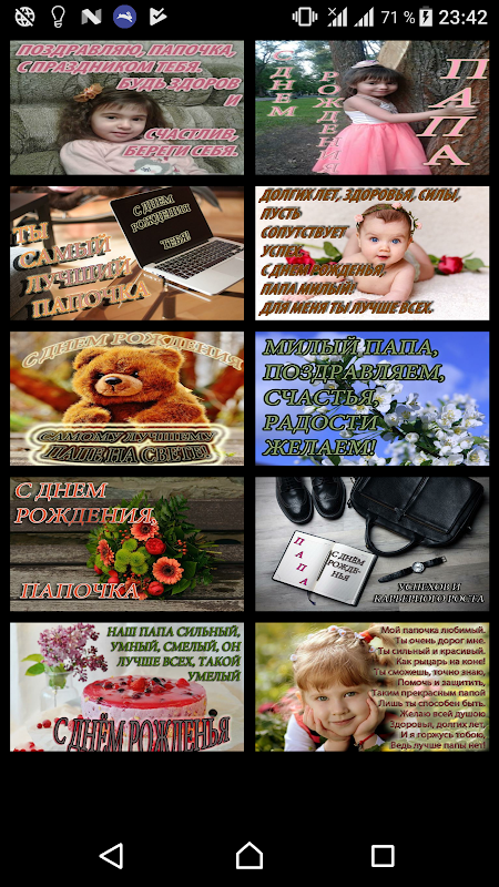 День Рождения- светлый праздник! Его принято отмечать в кругу родных, близких, друзей, но если Вы оказались далеко от именинника, тогда это приложения как никогда кстати. Открытки с днем рождения нашего приложения бесплатно на любой вкус. Большое количество красивых картинок для вас, ваших друзей, близких, любимых ко дню рождения. Чтобы было удобно их использовать, сделана разбивка на категории: маме и папе, подруге и другу, сестре и брату, любимому и для любимой, а также категория другие, которая подойдёт всем из уже упомянутых и не только.