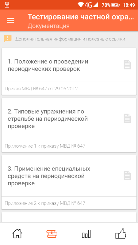 Назначение программы - подготовка частных охранников 4, 5 и 6 разряда к тестированию и сдаче экзамена или периодической проверки. Программа позволяет пройти тестирование по актуальному на данный момент списку из 193 вопросов. Тестирование разбито по разрядам.