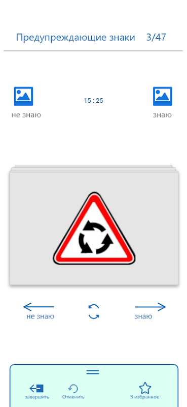 Раздел обучение - это ПДД с иллюстрациями на учебных карточках: на каждой карте приведена картинка с дорожной ситуацией и вопрос о ней. Вы сами придумываете решение данной ситуации, а затем переворачиваете карту, чтобы увидеть, является ли Ваше решение правильным.
