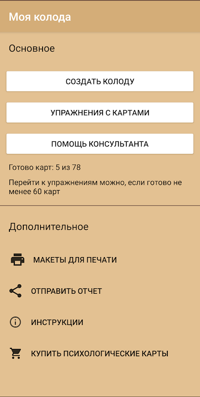 Untuk sepenuhnya bekerja dalam aplikasi, Anda harus membuat dek pribadi Anda sendiri. Setelah memilih 78 tipe gambar untuk deskripsi tipe dan arketipe yang sesuai (ini dapat berupa potret pahlawan sastra atau idola film, bintang bisnis pertunjukan atau politik, kenalan atau teman, dll.), Anda dapat melakukan lusinan latihan dengan berbagai topik: pengembangan diri, mencari sumber daya internal, hubungan dalam keluarga dan dalam tim kerja, membangun karier dan banyak lagi.
