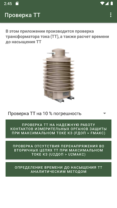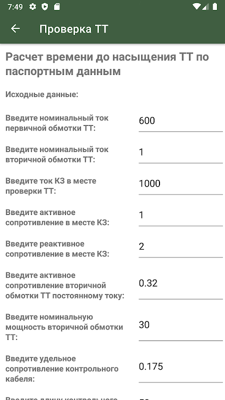 В данном приложении осуществляется проверка трансформатора тока на допустимую погрешность и расчет времени до насыщения трансформатора тока.
