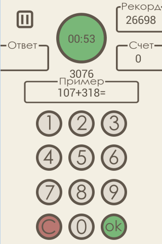 "За определенный промежуток времени необходимо решить как можно больше примеров. Их сложность зависит от выбранного уровня. На решение каждого примера выделяется 10 секунд, если пример решается быстрее, то оставшиеся секунды прибавляются к основному времени! Если пример будет решен неверно, то секунды будут вычтены из основного времени, соответственно! За каждый правильный ответ игрок получает очки, которые эквивалентны времени, потраченному на решение примера. Уровень сложности, как и тип примеров, игрок может выбрать самостоятельно! Тренируйте память и устанавливайте новые рекорды!"