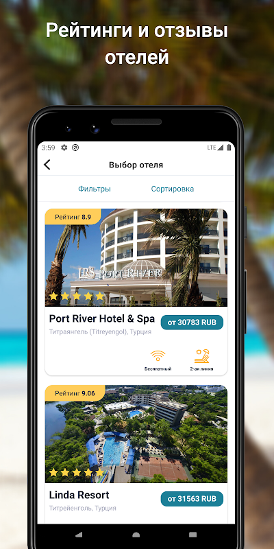 • kenyamanan antarmuka. Kami telah menciptakan program yang paling nyaman untuk digunakan, di mana Anda dapat dengan mudah menemukan penawaran yang menguntungkan, murah dan menit terakhir dari operator tur terkemuka, membaca ulasan hotel dan membandingkan semua opsi;