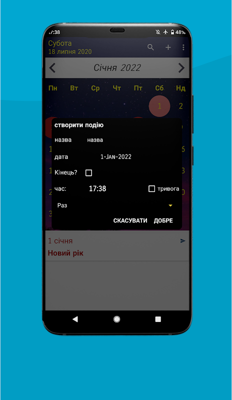 Dalam kalender hari libur Ukraina ini, hari libur umum dan tanggal yang tak terlupakan di Ukraina ditunjukkan. Ada fungsi penomoran minggu, widget dan dukungan sinyal. Setelah menyalakan sinyal, Lagu Kebangsaan Ukraina "Ukraina belum mati" akan dimainkan. Anda juga dapat menyetel nada dering apa pun untuk alarm kalender.