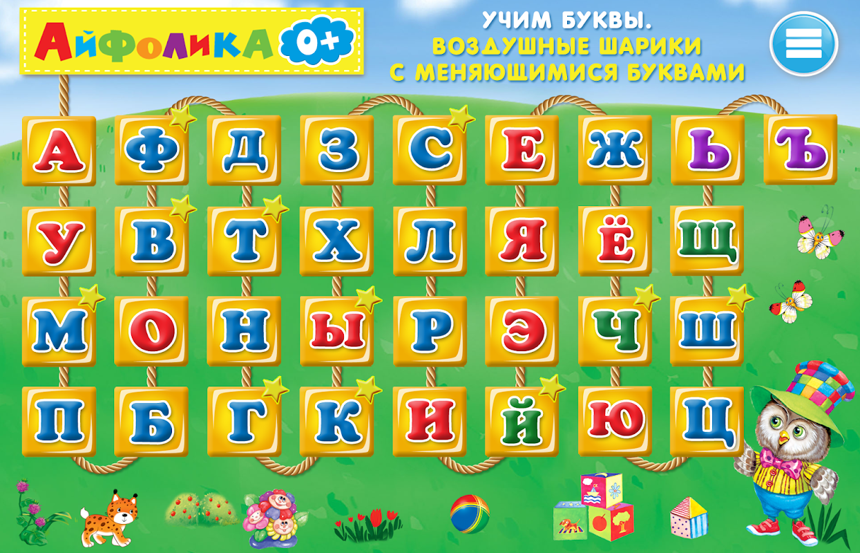 Sebuah aplikasi interaktif untuk mengajar anak-anak huruf alfabet Rusia.