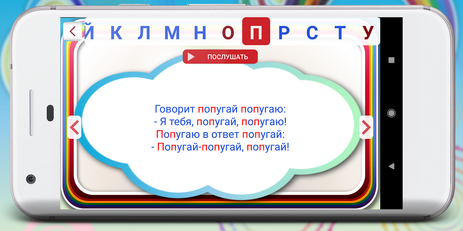 Учим буквы и слова – аудиоприложение, которое поможет вашему ребёнку выучить алфавит. Оно содержит в себе информацию о каждой букве, слова, чистоговорки, загадки и стихи. Приложение знакомит с произношением и написанием букв, в ходе игры позволяет малышу проверить свои знания, с помощью иллюстраций и картинок знакомит с разными словами, чистоговорки помогают выработать правильную дикцию, а стихи отлично развивают память!