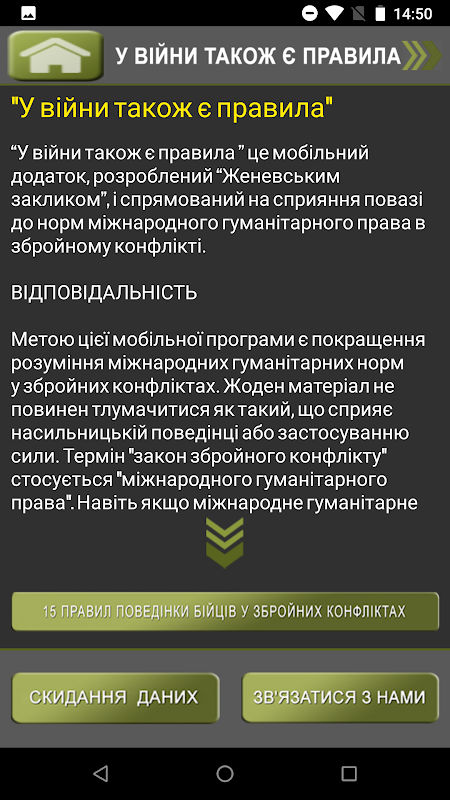 Вітаємо у додатку «У війни також є правила», вікторину-тест, яка дозволить Вам перевірити свої знання законів збройних конфліктів.