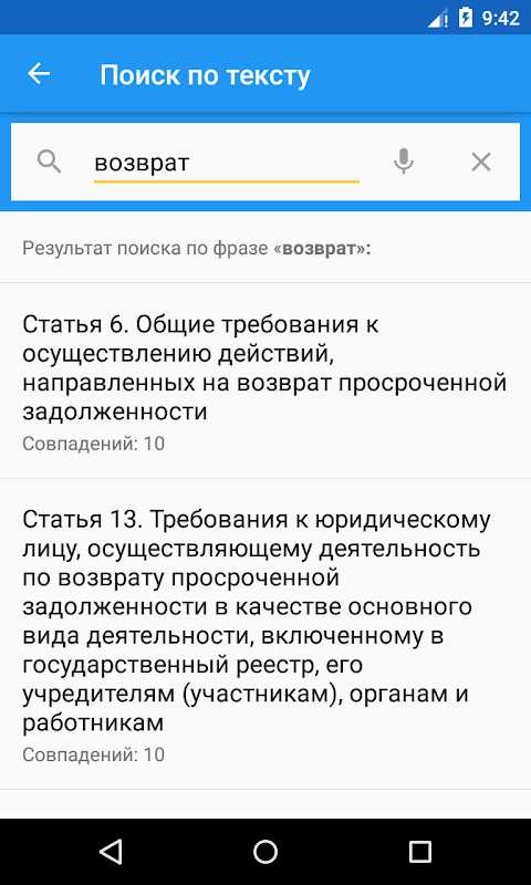 - Просмотр текста закона в виде удобного перелистывания статей, возможностью копирования выделенного фрагмента, поиска по тексту, поиска в сети интернет