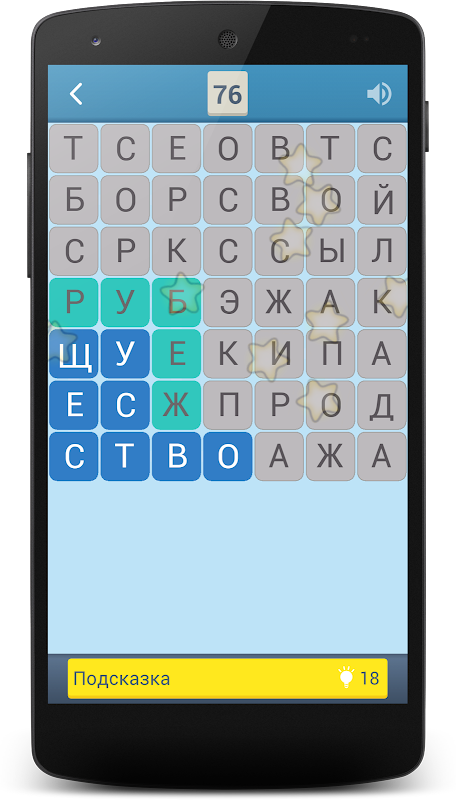 Выделяйте пальцем буквы и находите все слова, чтобы пройти уровень.