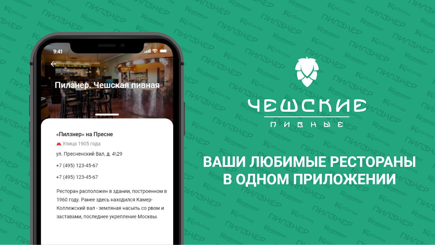 Ini adalah aplikasi dari restoran Pivne Ceko, yang menyatukan tiga rantai restoran masakan tradisional Ceko di Moskow: Pilsner, Kozlovitsa dan Kozlovna.