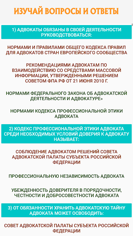 Antarmuka yang sederhana akan memungkinkan Anda untuk melakukan pelatihan di mana saja, mengingat poin utama Undang-Undang Federal "Tentang advokasi dan profesi hukum di Federasi Rusia" dan Kode Etik Profesional Pengacara.