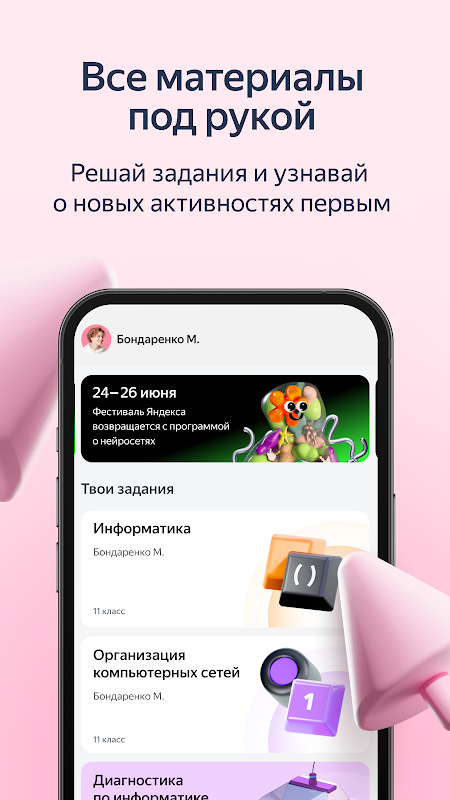 Mekanika yang menarik alih-alih menjejalkan: seret, sambungkan, pilih, ciptakan. Berpartisipasi dalam proyek Yandex, webinar, dan festival. Ikuti tes diagnostik dalam ilmu komputer dan benamkan diri Anda dalam dunia TI.