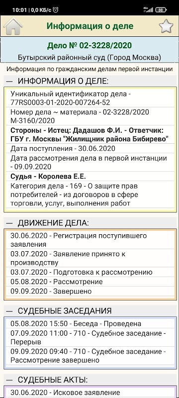 - Kecepatan menampilkan informasi oleh program (ketika mencari atau menampilkan informasi tentang kasus) sangat bergantung pada kecepatan tanggapan situs web pengadilan (mungkin berbeda) terhadap permintaan program, jumlah informasi yang dikirimkan, serta pada kecepatan koneksi Internet saat ini. Selain itu, tidak jarang informasi tentang perkembangan kasus tidak tersedia sama sekali di situs web pengadilan (aplikasi akan memberi tahu Anda tentang hal ini).