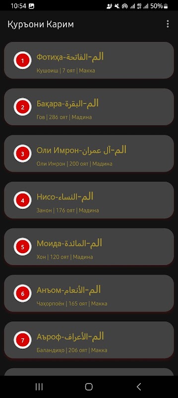 1. “Fotikha”, 2. “Bakara”, 3. “Oli Imron”, 4. “Niso”, 5. “Moida”, 6. “Anom”, 7. “A'rof”, 8. “Anfol” , 9 .