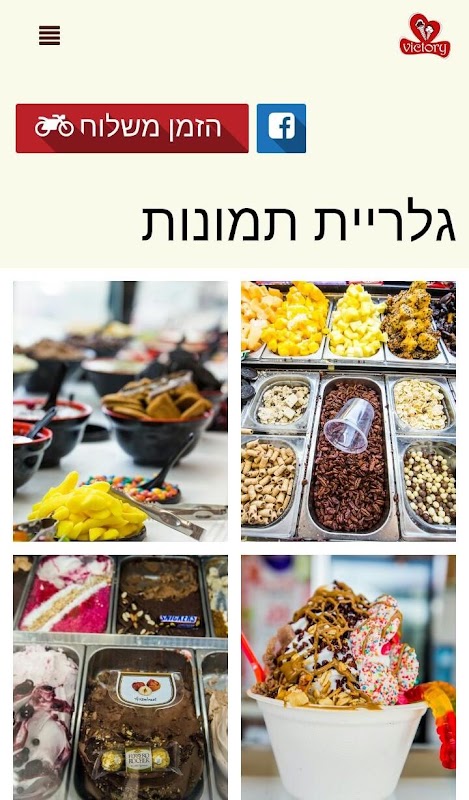 גלידת ויקטורי בראשון לציון מתמחה במגוון סוגי הגלידות: מגלידות סורבה בטעמי פירות מרעננים, ועד לגלידות שמנת מתקתקות. הגלידות של ויקטורי בראשון לציון, מיוצרות מדי יום משמנת טבעית עם תוספי טעם מחומרי גלם איכותיים. ניתן למצוא במקום גם גלידות ללא סוכר בטעמים מתחלפים כגון קפוצ'ינו או בננה. מתחשק לכם להתפנק בקינוח מושחת שימתיק לכם את היום? אתם מוזמנים ליהנות בנוסף לגלידות המשובחות של ויקטורי, גם מקרפ צרפתי עם כדורי גלידה, או וופל בלגי עם סירופ וקצפת שישדרגו לכם את הטעם. היוגורט של ויקטורי טבעי ללא סוכר, ומוגש עם פירות טריים המשתנים לפי עונה, רטבים מיוחדים ותוספות לבחירה כמו מקופלת, קוקוס, פרלינים ועוד. אם מתחשק לכם משקה צונן ומתוק, תימצאו בגלידת ויקטורי ראשל"צ אייסים במבחר טעמים: וניל, קפה, טבעי, תות, בננה ושמנת, פרי שייקים טבעים על בסיסי מים, חלב או יוגורט וגם מילקשייק מעולה עם תוספת קצפת. אומנם תפריט הקינוחים של גלידת ויקטורי עשיר להפליא, אבל תוכלו למצוא גם מנות אחרות שיעשו לכם את היום כמו פיצה, תפוח אדמה מוקרם וטוסט טעים.