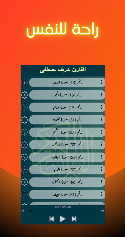 Aplikasi Sheikh Reciter Sharif Mustafa tanpa jaring berisi rekaman surah dari Al-Qur'an dengan: