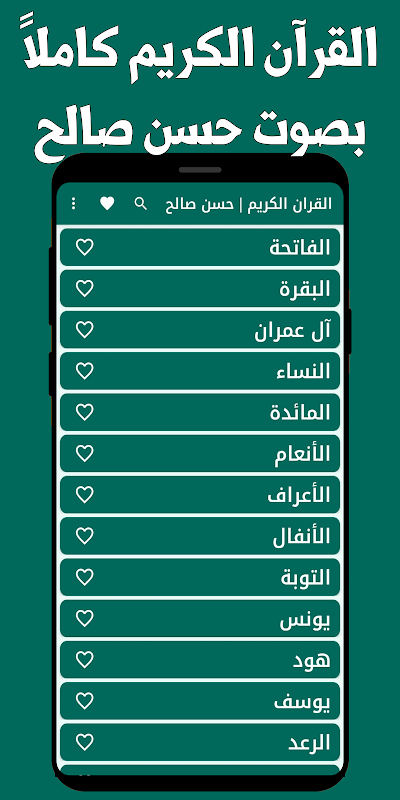 Antarmuka yang sederhana dan elegan, di mana Anda dapat memilih surah yang Anda suka, menambahkannya ke daftar favorit, dan mendengarkannya tanpa internet, dengan suara qari Sheikh Hassan Saleh, yang memiliki suara indah yang membuat Anda rendah hati untuk mendengarkan ayat-ayat Allah.