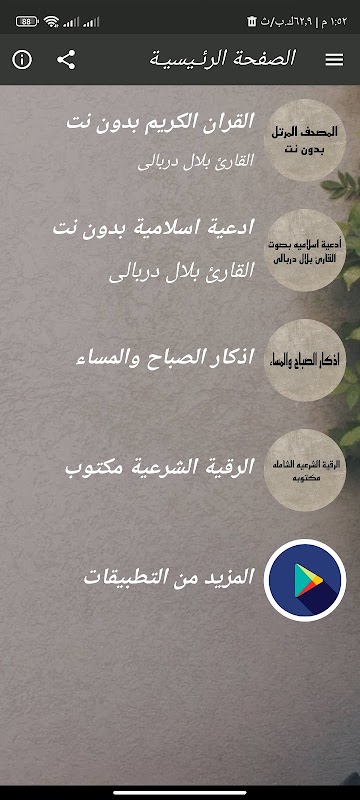 Al-Qur'an yang dibacakan tanpa jaring oleh qari Bilal Darbali, yang membacakan kepada kita dari bacaannya yang harum dengan suara selibatnya, banyak bacaan. Pilih untuk menjadikannya sebagai nada dering, dan kemudian Anda akan menemukannya di ponsel Anda di musik Anda pembaca. Aplikasi ini juga dapat mengatur nada notifikasi dan nada dering dari dalam aplikasi. Aplikasi ini juga berfungsi sepenuhnya tanpa perlu internet dan ada kertas hukum yang komprehensif untuk perlindungan manusia yang ditulis dari Al-Qur'an. Ada juga zikir di dalam aplikasi zikir pagi dan malam adalah aplikasi yang komprehensif dan khas Kami akan menyebutkan kepada Anda beberapa surah yang dibacakan oleh pembaca: