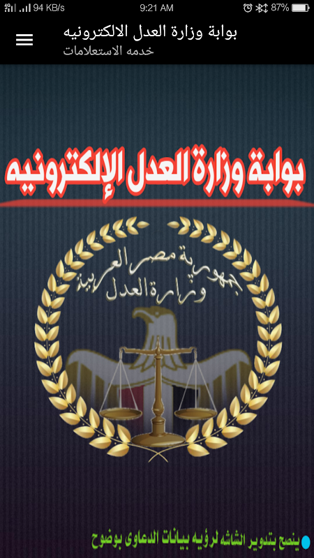 البرنامج مقدم لتسهيل خدمه الاستعلام المجاني للمحامي واصحاب الشأن عن الدعاوي المدنيه الكليه والجزئيه