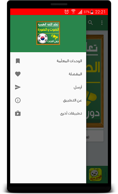 تطبيق تعلم اللغة الكورية صوت و صورة ، يمكنكم من تعلم اللغة الكورية بسرعة و بسهولة وبدون معلم، وأيضا سهل الإستخدام و بجودة صوت عالية ، و يعمل من دون الحاجة إلى انترنت.