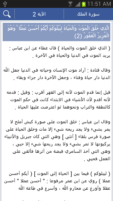 تفسير القران الكريم كامل بدون انترنت وفيه فهرس السور وفهرس آيات السورة المختارة وإمكانية البحث في القرآن الكريم مع إمكانية كتابة ملاحظة على إعراب آية معينة وإمكانية وضع علامات متعددة على