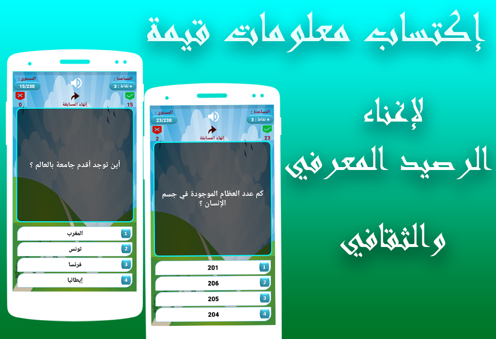 Budaya dan Sains: Ini adalah permainan informasi umum dan budaya yang menyenangkan dan menghibur, itu adalah tautan yang menantang dan permainan manfaat dan hiburan untuk meningkatkan tingkat keseimbangan pengetahuan takafa 3ama, di mana pertanyaan dan empat jawaban ditanyakan secara acak, yang merupakan keberuntungan, dan pemain harus menemukan jawaban yang benar dalam arti teka-teki tersembunyi, Ketika pertanyaan-pertanyaan ini berputar di sekitar budaya umum taqafa 3ama, yang merupakan permainan gas yang menyenangkan dalam arti kompetisi himpitan budaya budaya yang terdiri dari kompetisi budaya dalam bentuk tautan yang menantang, di mana orang tersebut dapat menguji dirinya sendiri dan memperkaya keseimbangan ilmiah, kognitif, dan budaya agar orang tersebut menjadi penduduk desa orang Arab dari petani. Mereka yang memiliki budaya dan pengetahuan umum Di berbagai bidang. ma3lomat 3ama atau yang disebut mendidik diri sendiri ta9if nafsak dan menikmati bermain.