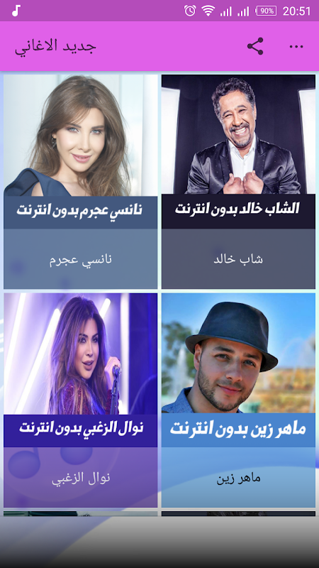 يحتوي التطبيق على تشكيلة منوعة من الاغاني لاشهر المطربين و الفنانين العرب نانسي عجرم و اليسا و نوال الزغبي و محمد حماقي و الشاب خالد و ماهر زين