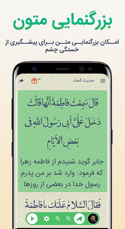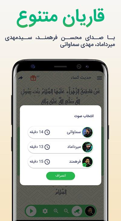 حدیث کساء صوتی با صدای محسن فرهمند، مهدی سماواتی و سید مهدی میرداماد .با ظاهری مدرن و بدون نیاز به اینترنت با اسکرول ( پیمایش ) خودکار