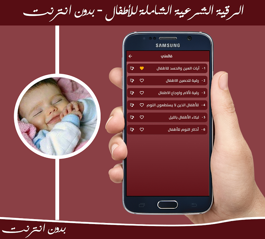 ❇ ارتأينا أن تكون هذه الرقية الشرعية للاطفال الرضع بدون انترنت وبدون الحاجة للاتصال بالشبكة حتى يسهل استخدامها في كل وقت وهي رقية رقية الاطفال الشرعية الشاملة اذ تتضمن آيات الشفاء نافعة لجميع الامراض فهي الرقية الشرعية الشاملة لعلاج العين و المس و السحر و الحسد وهي رقية من القران والسنة كل آياتها من القران الكريم