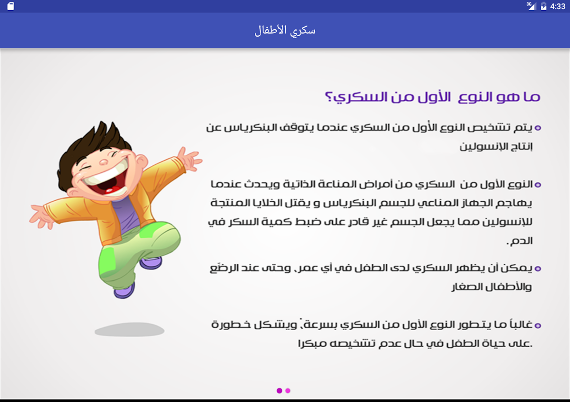 يقدم تطبيق سكري الأطفال معلومات توعوية وإرشادات حول النوعين الأول والثاني للسكري للسكري كما يلي: