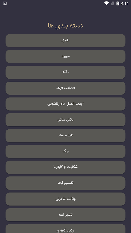 سوالاتی در مورد نفقه - مهریه - طلاق - ازدواج - چک و اجاره و حقوق مربوط به قرارداد ها تقسیم ارث و میراث - قانون مربوط به تجاوز قتل و غیره همه در اپلیکیشن وکیلم