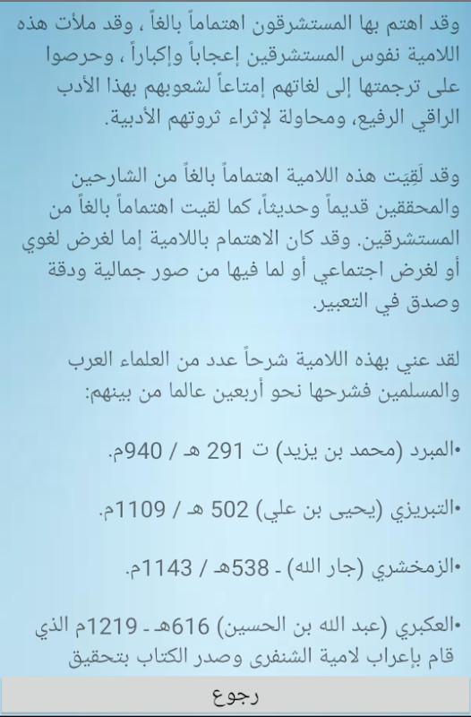 Anda dapat melalui ini aplikasi View terjemahan Shanfari, atau informasi tentang buta huruf dari orang-orang Arab, dan Anda dapat melihat bentuk puisi set .. Seperti yang Anda memilih rumah rumah puisi untuk melihat penjelasan dari rumah atau dipotong Arozia atau menampilkan beberapa variasi dalam novel rumah .. Puisi dari laut yang panjang ..