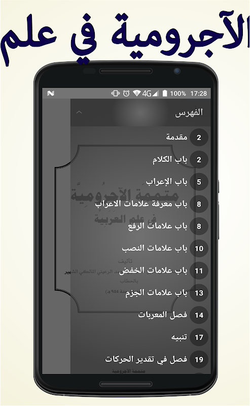 • بمجرد فتح قائمة التصفح في تطبيق متممة الآجرومية في علم العربية يظهر لك الباب المفتوح حاليا بخلفية داكنة.