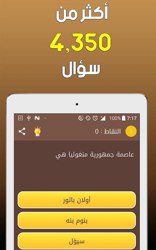 * Kompetisi termasuk geografi dunia Arab dengan fokus besar, karena mencakup semua kota terkenal, pelabuhan, semua sungai, teluk, pulau, perbatasan, pegunungan ... dll dan di semua negara Arab.