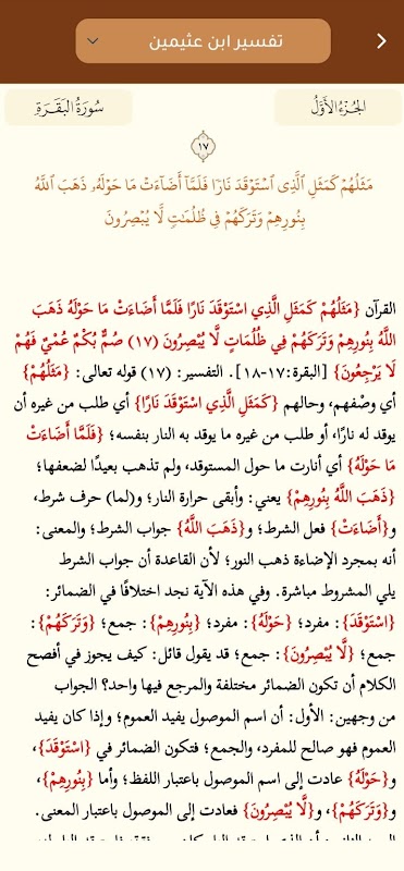 • Kemampuan untuk mengakses interpretasi Syekh Ibnu Utsaimin dengan mengklik ayat saat membaca.