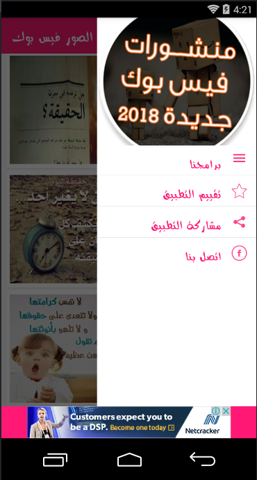 يحتوي تطبيق منشورات مع الصور للفيس بوك على مجموعة كبيرة من الصور الرائعة التي تتضمن منشورات مميزة للفيسبوك، كما يتضمن تطبيق منشورات مع الصور للفيس بوك على صور معبرة وبكلمات مؤثرة للمشاعر التي نشعر بها جميعنا فتطبيق منشورات مع الصور للفيس بوك يشمل عبارات رائعة متنوعة وهذه الصور الموجودة في تطبيق منشورات مع الصور للفيس بوك صممت خصيصا لاستخدامها على مواقع التواصل الاجتماعي كالفيس بوك حيث بإمكانكم استخدام هذه الصور المعبرة على صفحاتكم الشخصية على الفيسبوك أو على المجموعات المنشأة على الفيسبوك