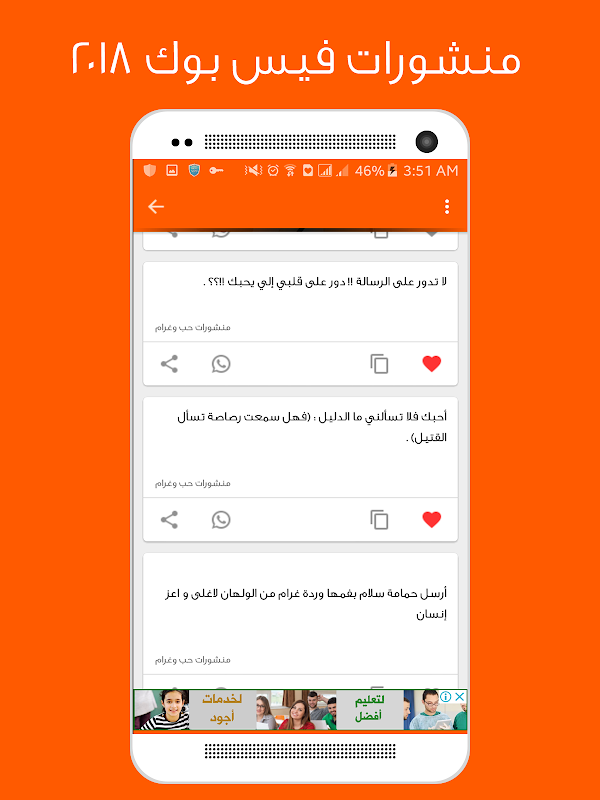 يقدم افضل واجدد المنشورات والبوستات للفيس بوك والواتس اب وجميع مواقع التواصل الاجتماعي ليتم تبادل المحبة بين الاصدقاء والاحباب والاخوة عبر تصفح القيم الدي تريده وتقوم بنسخ الحالة ولصقها اينما تريد كل ذلك من داخل التطبيق فقط