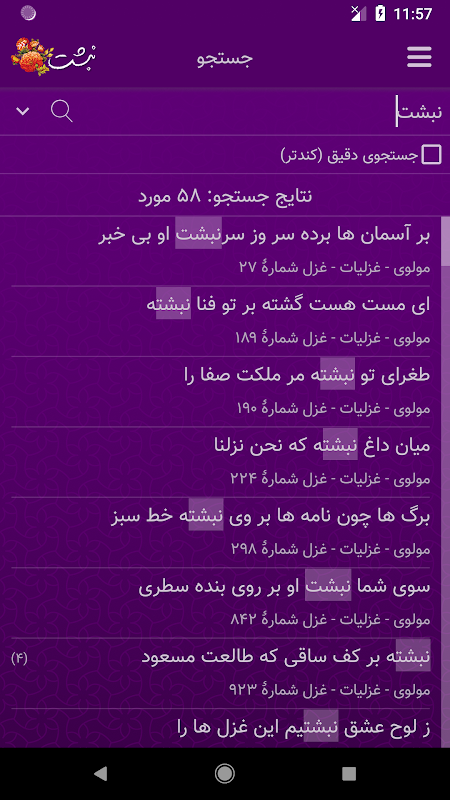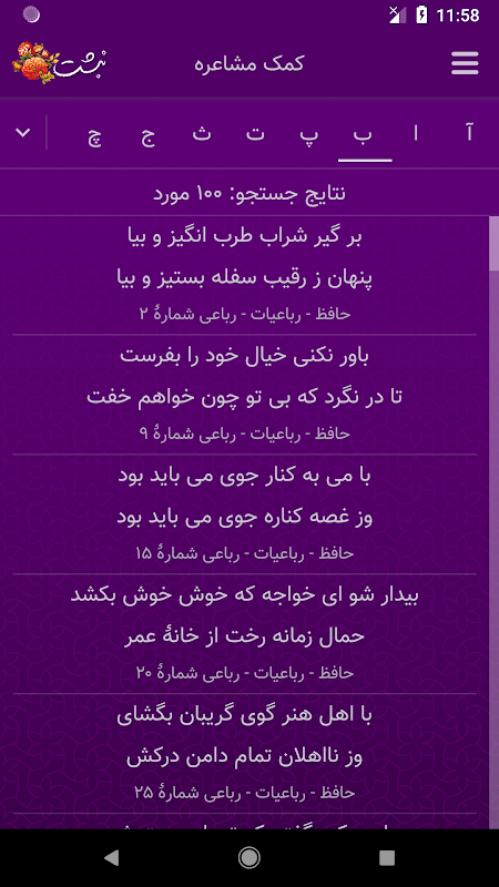 Penulisan harta karun puisi yang berharga oleh penyair Iran, termasuk karya 77 penyair dari penyair kuno hingga kontemporer dengan lebih dari satu juta ayat, yang disajikan sepenuhnya gratis kepada semua pecinta sastra Persia.