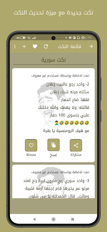 Cukup aplikasi ini adalah komunitas lelucon Arab, semua orang dapat menambahkan lelucon mereka sendiri atau pada umumnya aplikasi menghibur yang menyediakan lelucon terbaru yang diperbarui secara langsung, yaitu lelucon baru yang diperbarui yang mencakup lelucon dari negara-negara Arab seperti lelucon Mesir, lelucon Palestina , Lelucon Aljazair, Lelucon Suriah dan Lelucon Maroko Dan Lelucon Irak, Lelucon Lebanon, dan Negara Lain, karena berisi banyak bagian lain, seperti Lelucon Mahshchin, dan juga bagian dari lelucon menikah, lelucon gila, berbagai lelucon, dan banyak bagian lainnya dan yang membedakan aplikasinya :