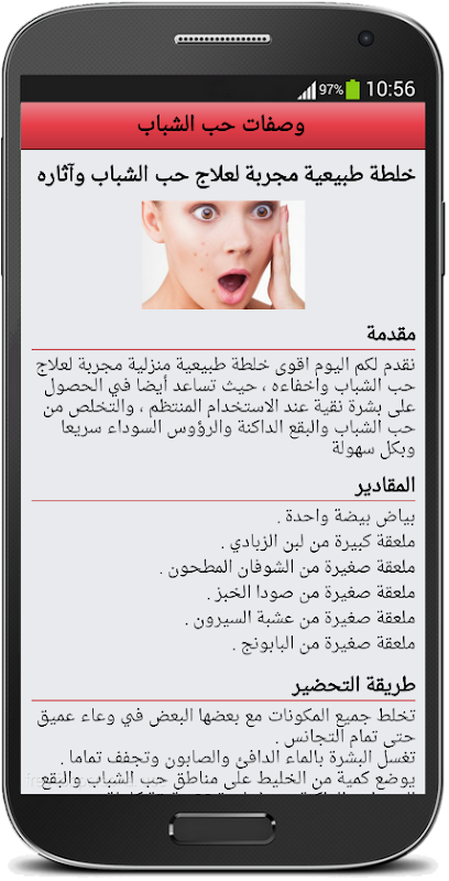 يحتوي تطبيق وصفات لازالة حب الشباب نهائيا على اكثر من 15 وصفة و خلطة و اقنعة للوجه مجربة بدون أنترنيت متجددة بستمرار و هذه بعضها :