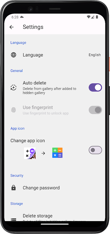 Ikon program dapat diubah menjadi ikon kalkulator, dan jika seseorang memasuki galeri tersembunyi, dia akan menemukan kalkulator dan tidak akan pernah mengetahuinya.