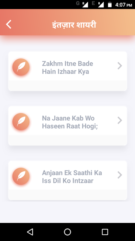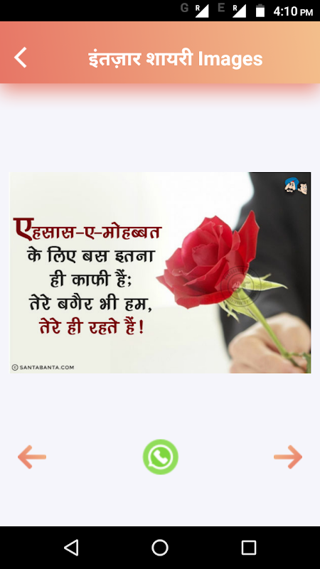 Intezaar Hindi Shayari application for android brings best collection of Hindi Shayari. Intezaar Shayari is like a vast ocean. Walking along its shores on the sands of time, We have gathered a few gems that we would like to share with you.